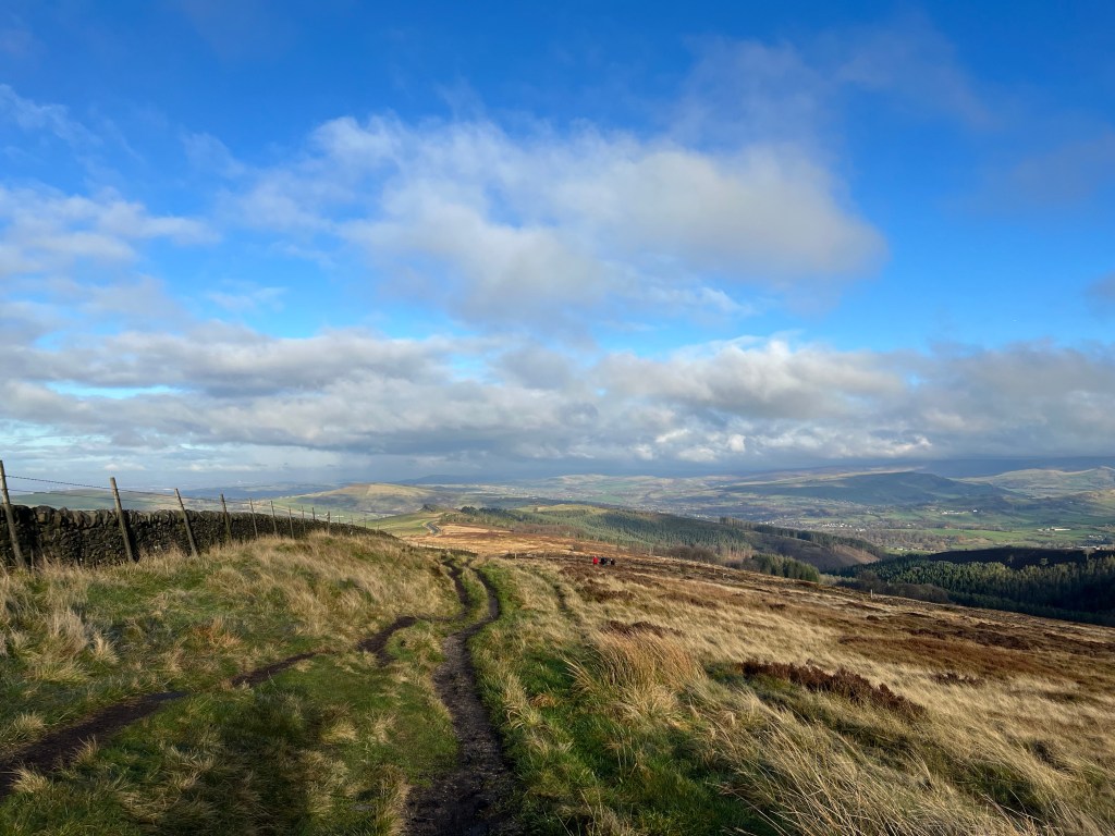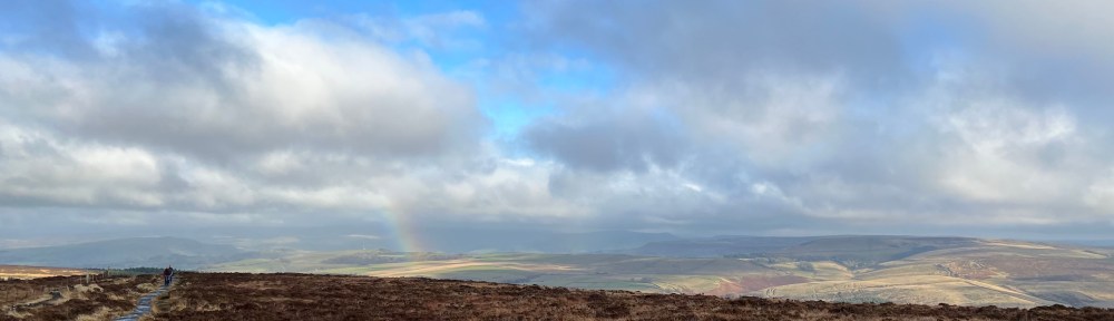 Back to Shining Tor today, 2 miles from Buxton in the Goyt Valley. A steady ascent to 600 metres on a slabbed path apparently airlifted from abandoned mills in the Pennines to save the environment being ruined by walkers. The views along the way take in pretty much every Peak in the Peak District, Manchester, Cheshire and further with some blisteringly clear moments and the odd rainbow.