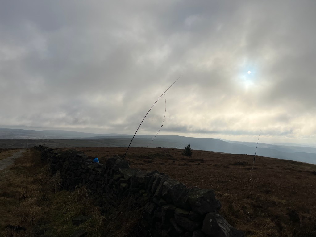 Weather was a bit changeable with freeze your socks off stuff at the top. At the trig point by the dry stone wall was what looked like a large fishing road and a shorter pole stuck in the ground a few feet away.