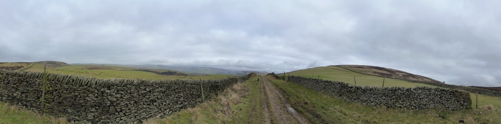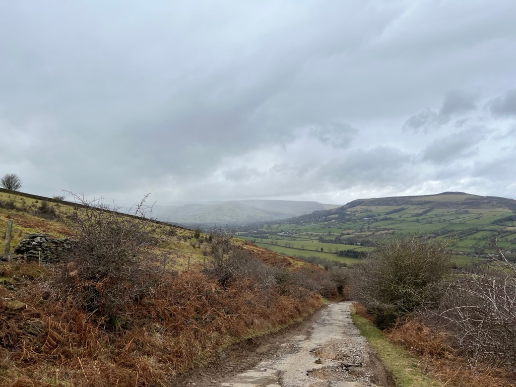 The byway, a wide track between dry stone wallage slowly turned around the top in a glorious sweep offering giant puddles and panoramic views of the Hope Valley, distant peaks, Abney and more. A cheeky glimpse of the Derwent valley reservoir where Dambusters was filmed in the distance. Passed a small group of people learning orienteering skills, carefully studying laminated maps with keen interest and windswept chops.